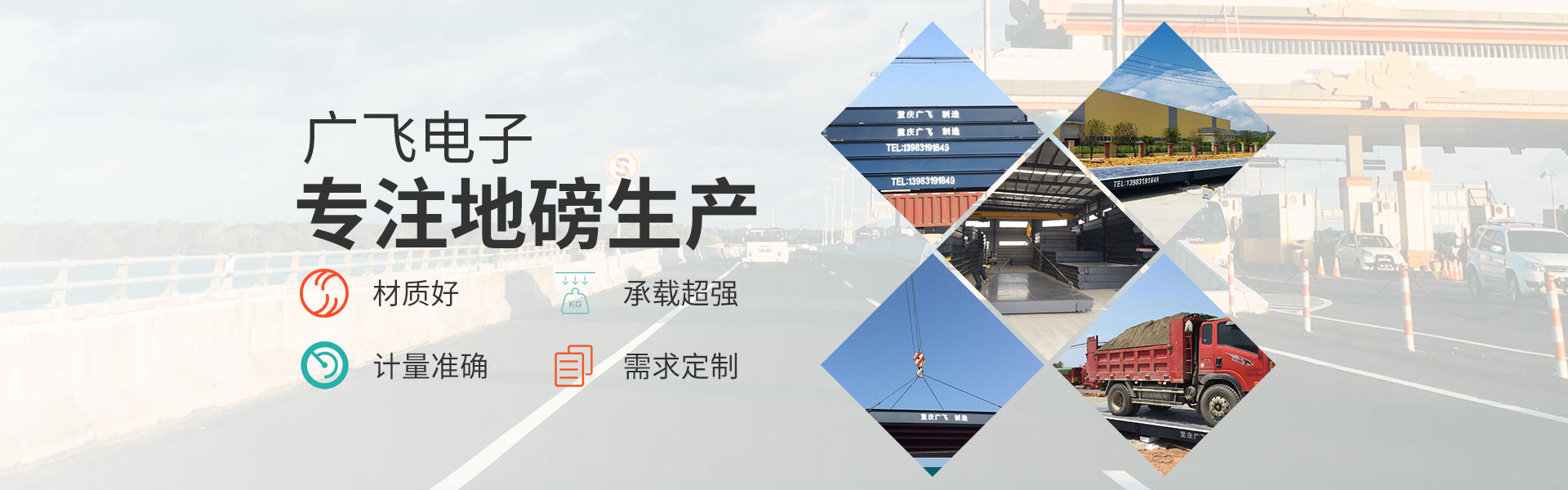 重慶廣飛電子有限公司,是一家集衡器生產、技術研發(fā)、產品銷售及售后服務于一體的高科技企業。 產品囊括電子汽車衡(電子地磅)、無人值守地磅稱重管理系統、電子地上衡、智能稱重管理系統、電子軌道衡、電子吊秤、電子臺秤、電子皮帶秤、鏟車秤、公路超載超限系統等全系列稱重產品。